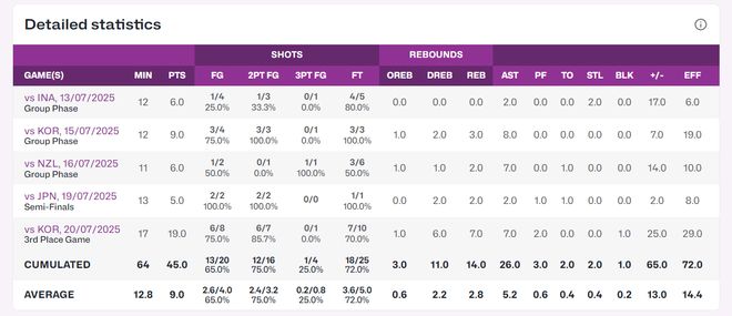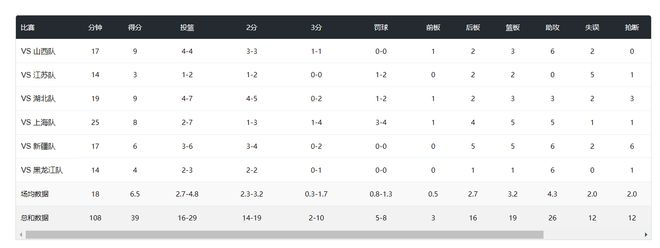 全运会第一阶段王思雨的发挥也很划水,场均18分钟,拿到6.5分4.3助攻3.2篮板2抢断,命中率55.1%,三分命中率20%。