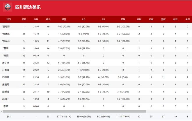 这场比赛四川女篮轮休了李梦这位主力,高颂也只打了6分钟,而王思雨打了24分钟,全场比赛她10中7,三分5中3,罚球2中2,拿到19分3篮板2助攻4抢断,命中率70%,三分命中率60%,王思雨打出了攻防一体的表现。