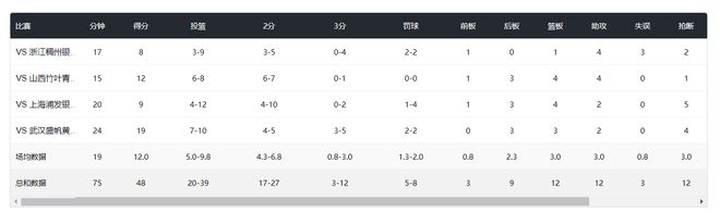 为什么说王思雨是觉醒呢?因为此役之前只有一场双双,场均19分钟,拿12分3助攻3篮板3抢断,命中率51.2%,三分命中率25%很明显是划水的状态。